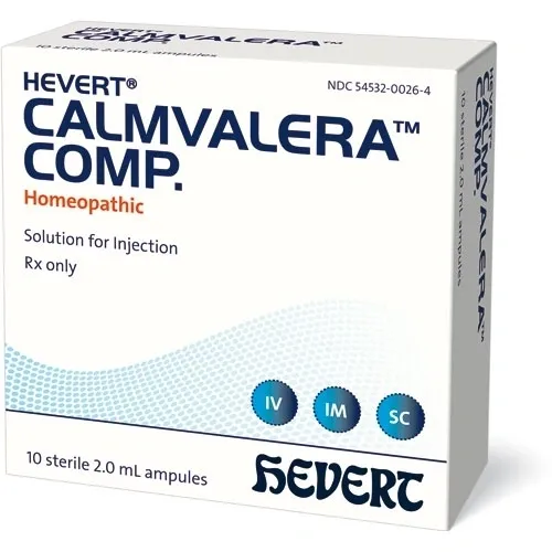 For the treatment of nervous disorders, such as restlessness and sleep disorders, mild depressive states, and mental exhaustion. Hevert Calmvalera Comp. may be administered intravenously, intramuscularly, or subcutaneously.  Rx Use Only.
